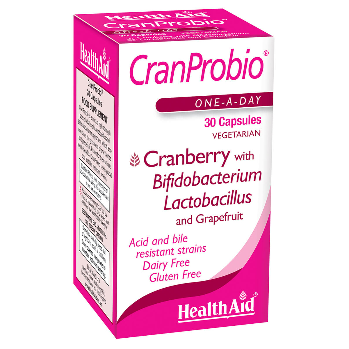 1. Health Aid CranProbio Συμπλήρωμα Διατροφής με Προβιοτικά, Κράνμπερυ & Γκρέιπ Φρουτ για την Υγεία του Γυναικείου Ουροποιητικού, 30 Ταμπλέτες. Το CranProbio της HealthAid είναι μοναδικός συνδυασμός με 3 είδη προβιοτικών στελεχών (Lactobacillus Acidophilus, Bifidobacterium Lactis, Bifidobacterium Bifidum), σε ποσότητα 5 δισεκατομμυρίων/κάψουλα, μαζί με Κράνμπερυ και Γρέιπφρουτ.