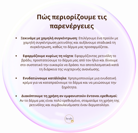 - Αίσθημα καύσου ή κνησμού: Μερικοί άνθρωποι μπορεί να αισθανθούν καύσο ή κνησμό μετά την εφαρμογή της ρετινόλης.