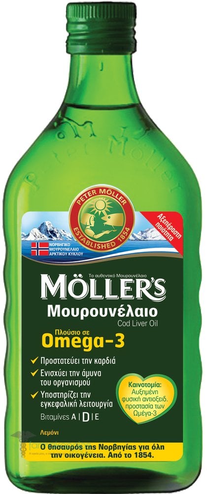 3. Moller's Μουρουνέλαιο Cod Liver Oil σε Υγρή Μορφή με Γεύση Λεμόνι, 250ml. Το Moller's Μουρουνέλαιο Lemon παραδοσιακό μουρουνέλαιο σε υγρή μορφή με γεύση Λεμόνι περιέχει συνδυασμό φυσικών ω-3 λιπαρών οξέων με βιταμίνες D3, A και Ε. Η ημερήσια δόση (5 ml) προσφέρει 1200 mg ω-3 λιπαρών οξέων με ευεργετικές επιδράσεις στην καρδιά, το κυκλοφορικό, την εγκεφαλική λειτουργία και την όραση.