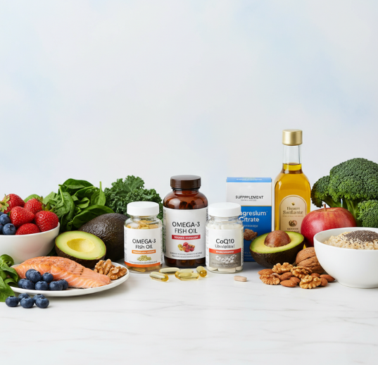 Μια ισορροπημένη μεσογειακή διατροφή πλούσια σε φρούτα, λαχανικά, ψάρια, ξηρούς καρπούς και ελαιόλαδο ενισχύει την καλή λειτουργία της καρδιάς. Tα συμπληρώματα διατροφής που συμβάλλουν στην υγεία της καρδιάς είναι: