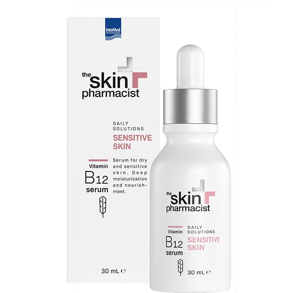 3. The Skin Pharmacist Sensitive Skin Vitamin B12 Serum Ενυδατικός Ορός Προσώπου για Ξηρές - Ευαίσθητες Επιδερμίδες, 30ml. Είναι ένας ορός βαθιάς ενυδάτωσης για πολύ ξηρό και ευαίσθητο δέρμα. Η δράση τoυ βασίζεται στις βιταμίνες Β12 & Ε, στο υαλουρονικό οξύ, στην πανθενόλη και σε μίγμα ενυδατικών παραγόντων όπως η τρεχαλόζη και η σερίνη. Αναπληρώνει την υγρασία του δέρματος, βελτιώνει την υφή του και αποκαθιστά την ισορροπία της ξηρής και κουρασμένης επιδερμίδας. Επίσης, αναζωογονεί και απαλύνει το ευαίσθητο δέρμα από την ξηρότητα, προσφέροντας άνεση όλη την ημέρα.
