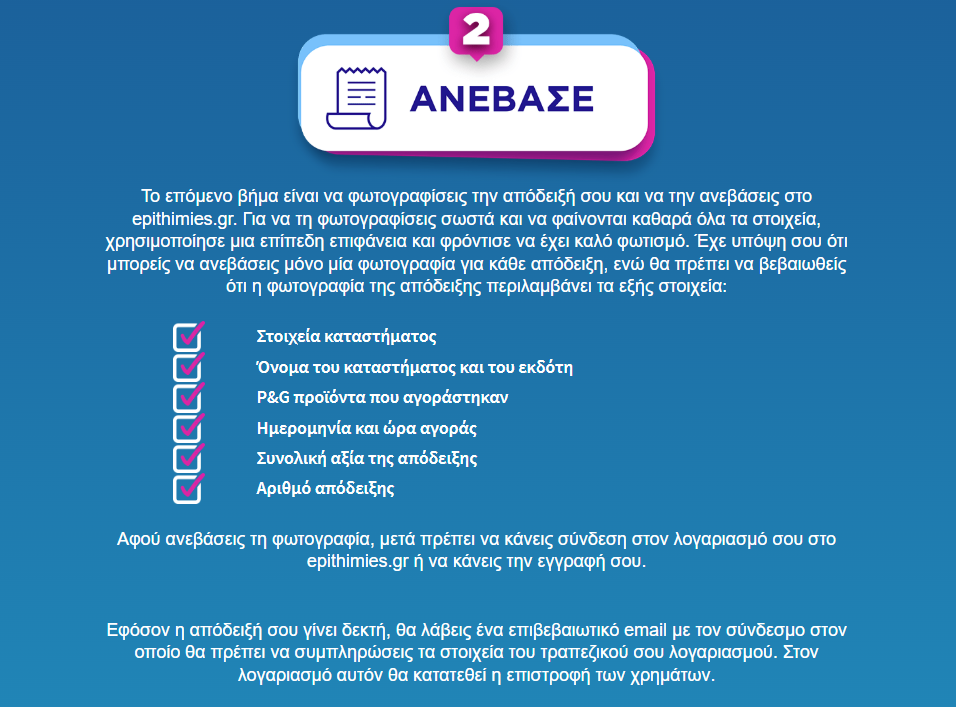 - Μετά την υποβολή της απόδειξής σου στην εκάστοτε προωθητική ενέργεια επιστροφής χρημάτων, θα σου αποσταλεί επιβεβαίωση συμμετοχής μέσω email. Μπορείς να ενημερώσεις τη διεύθυνση ηλεκτρονικού ταχυδρομείου σου στο προφίλ σου, στο epithimies.gr