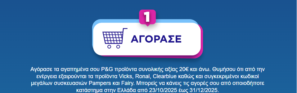 Με την αγορά προϊόντων P&G (*εξαιρούνται Vicks, Ronal, ClearBlue, Pampers MSB & MP) από 20€ και πάνω, επιστρέφονται στον καταναλωτή 10€.