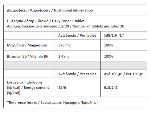Αναβράζοντα δισκία με μαγνήσιο και βιταμίνη B6. Το μαγνήσιο συμβάλλει στη φυσιολογική λειτουργία των μυών, στη σύνθεση των πρωτεϊνών και στην ισορροπία των ηλεκτρολυτών. Μαζί με τη βιταμίνη B6 συμβάλλουν στη μείωση της κούρασης και της κόπωσης, στη φυσιολογική ψυχολογική λειτουργία και στη φυσιολογική λειτουργία του νευρικού συστήματος.