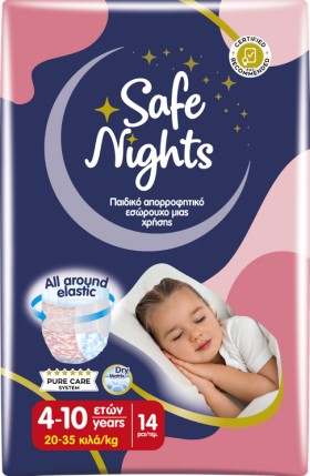 Τα ελαστικά απορροφητικά εσώρουχα μιας χρήσης Babylino Safe Nights Kids Pants, βοηθούν αποτελεσματικά στην προστασία από ατυχήματα νυχτερινής ενούρησης, συμβάλλοντας σε έναν άνετο ύπνο τη νύχτα, χαρίζοντας στα παιδιά άνεση και αυτοπεποίθηση.Είναι ειδικά σχεδιασμένα για κορίτσια μεταξύ 4-10 ετών με βάση το Σύστημα Αγνής Φροντίδας Pure Care System, που αποτυπώνει όλο το Σύστημα ελέγχων, πιστοποιήσεων και αυστηρών διαδικασιών διασφάλισης ποιότητας πίσω από την παραγωγή τους.