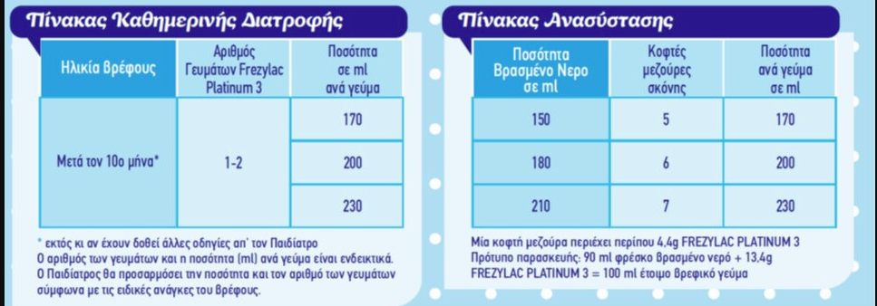 Το FREZYLAC PLATINUM 3 είναι ένα βιολογικό κατσικίσιο γάλα σε σκόνη κατάλληλο για βρέφη από τον 10ο μήνα. Σχεδιασμένο για χρήση στο πλαίσιο μιας μεικτής διατροφής, παρέχει πλήρη θρεπτική υποστήριξη ώστε να συμβάλλει στην υγιή ανάπτυξη του παιδιού.