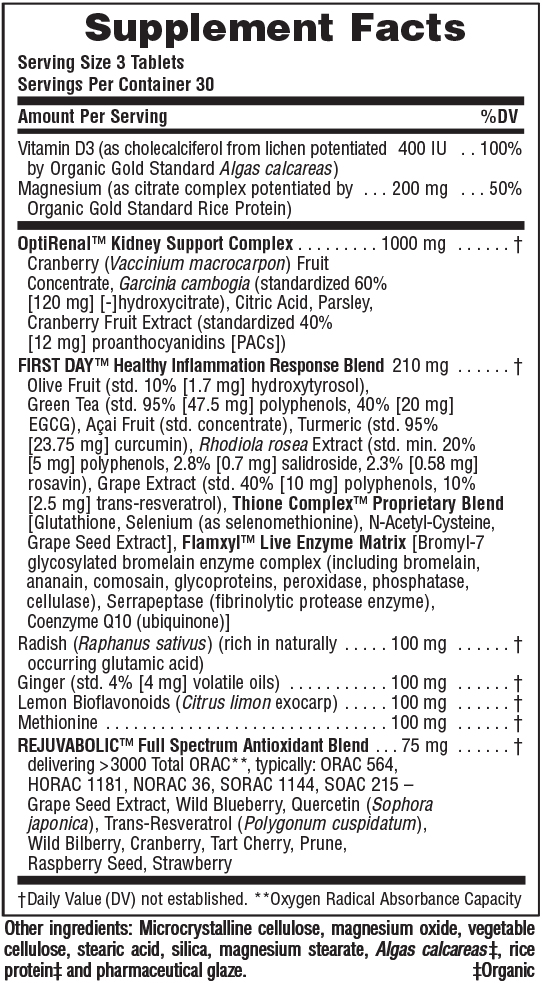 Περιέχει το σύστημα OptiRenal™ Kidney Support, τα αντιοξειδωτικά συμπλέγματα First Day™ και Rejuvabolic™ , ραπανάκι, ginger, βιοφλαβονοειδή λεμονιού, μεθειονίνη, καθώς και βιταμίνη D3 και μαγνήσιο για μείωση του οξαλοξικού οξέος, ενός από τους μεγαλύτερους εχθρούς των νεφρών. Περιέχει τιτλοδοτημένα εκχυλίσματα Cranberry, μαϊντανού και Garcinia cambogia σε υδροξυ-κιτρικό, κιτρικό οξύ και προανθοκυανιδίνες, μεγιστοποιώντας την εύρυθμη νεφρική λειτουργία και τη διούρηση.