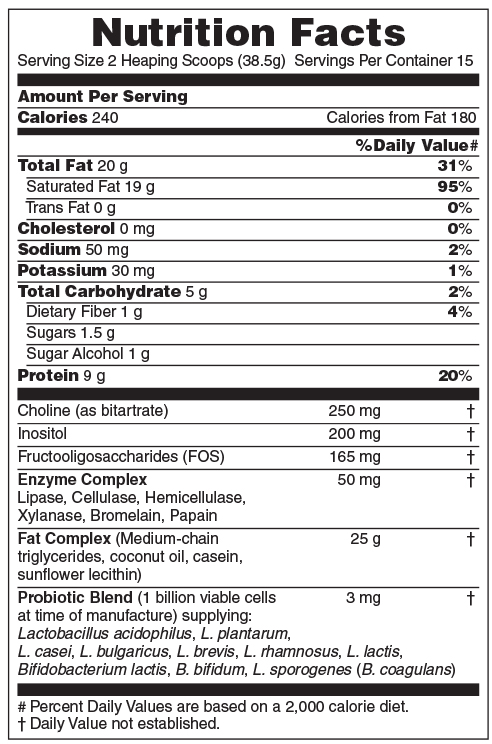 - Η πηγή λιπαρών που χρησιμοποιείται είναι τριγλυκερίδια μεσαίας αλυσίδας (MCTs), μια από τις καλύτερες επιλογές λιπαρών που χρησιμοποιείται για παραγωγή ενέργειας κατά τη διάρκεια κετογονικής διατροφής.