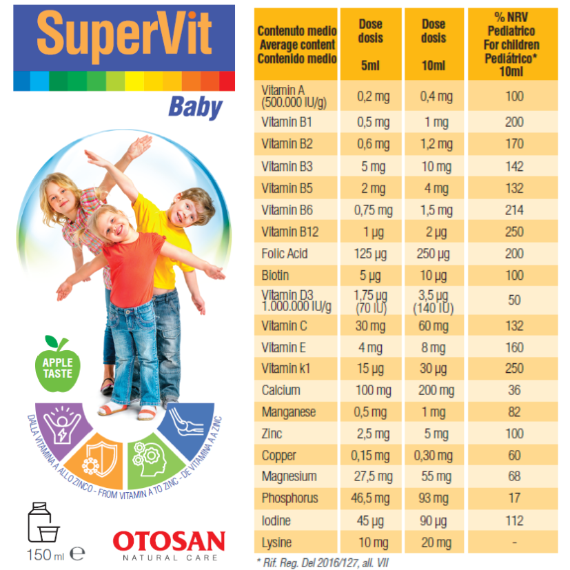 Το Otosan SuperVit Baby είναι ένα πολυβιταμινούχο και πολυμεταλλικό συμπλήρωμα διατροφής σχεδιασμένο για να υποστηρίζει τη φυσιολογική ανάπτυξη, ενέργεια και ευεξία των παιδιών. Η νέα του φόρμουλα, βασισμένη σε επιστημονική έρευνα, εξασφαλίζει ότι τα μικρά παιδιά λαμβάνουν τα απαραίτητα μικροθρεπτικά συστατικά για χαρούμενη και ενεργητική ανάπτυξη, με εύκολη και ευχάριστη γεύση μήλου. Οι 21 βιταμίνες και τα μέταλλα που περιέχονται στο εσωτερικό του προϊόντος παίζουν το ρόλο των συνενζύμων στις κύριες βιοχημικές αντιδράσεις του ενεργειακού μεταβολισμού, παρεμβαίνοντας στις διαδικασίες μετατροπής των πρωτεϊνών, των λιπιδίων και των υδατανθράκων σε ενέργεια.