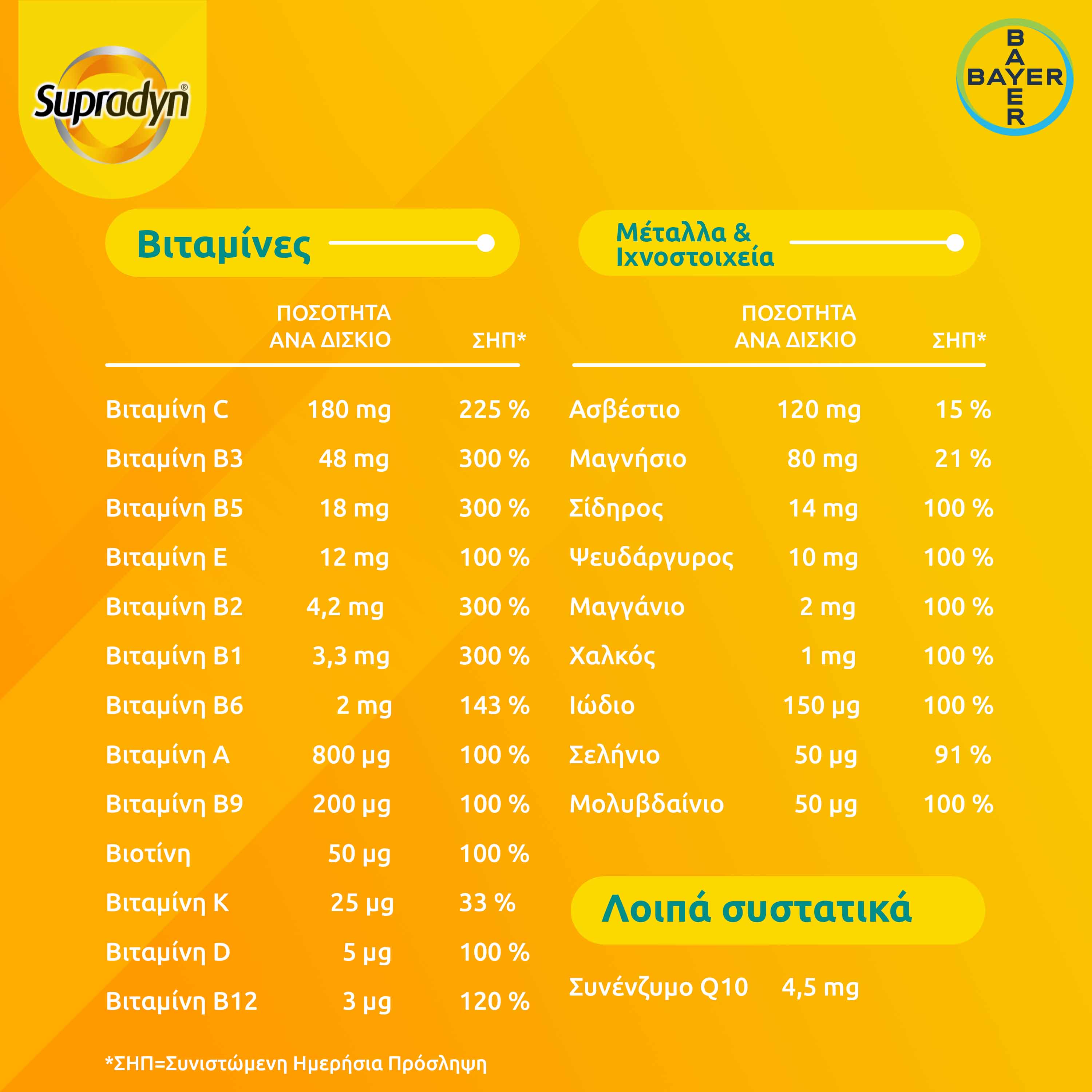 *Οι βιταμίνες Β2, Β3, Β5, Β6, Β9, Β12, C, ο σίδηρος, και το μαγνήσιο συμβάλλουν στη μείωση της κούρασης και της κόπωσης. Οι βιταμίνες Β1, Β2, Β3, Β5, Β6, Β7, Β12, C, το μαγνήσιο, o σίδηρος, το μαγγάνιο, ο χαλκός, και το ιώδιο, συμβάλλουν στη φυσιολογική λειτουργία των μεταβολικών διεργασιών που αποσκοπούν στην παραγωγή ενέργειας. Δεν περιέχει γλουτένη. Δεν περιέχει λακτόζη. Χαμηλή περιεκτικότητα σε ζάκχαρα, με γλυκαντικά. Να μην γίνεται υπέρβαση της συνιστώμενης ημερήσιας δόσης. Τα συμπληρώματα διατροφής δεν πρέπει να χρησιμοποιούνται ως υποκατάστατο μιας ισορροπημένης δίαιτας. Τα προϊόντα αυτά δεν προορίζονται για την πρόληψη, αγωγή ή θεραπεία ανθρώπινης νόσου. Συμβουλευτείτε τον γιατρό σας αν είστε έγκυος, θηλάζετε, βρίσκεστε υπό φαρμακευτική αγωγή ή αντιμετωπίζετε προβλήματα υγείας.