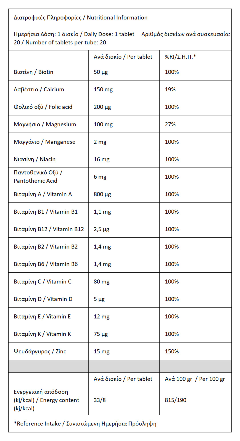 13 βιταμίνες και 4 μέταλλα για τη φυσιολογική λειτουργία του οργανισμού. Ένα σύμπλεγμα βιταμινών και μετάλλων που συμβάλλει στη φυσιολογική λειτουργία των μεταβολικών διεργασιών που αποσκοπούν στην παραγωγή ενέργειας, στη φυσιολογική λειτουργία του ανοσοποιητικού και νευρικού συστήματος, στη μείωση της κούρασης και της κόπωσης και στην προστασία των κυττάρων από το οξειδωτικό στρες.