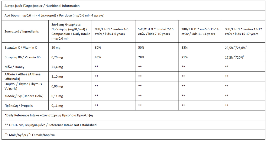 Μαλακώνει τον λαιμό και συμβάλλει στη φυσιολογική λειτουργία του ανοσοποιητικού με μέλι, αλθαία, πρόπολη, θυμάρι και βιταμίνη C. Φυσικό spray για τον λαιμό ειδικά σχεδιασμένο για παιδιά με βότανα ελληνικής γης (αλθαία, κισσό, θυμάρι) και προϊόντα μέλισσας (μέλι και πρόπολη), που παραδοσιακά καταπραΰνουν τον ερεθισμένο λαιμό. Μαζί με τις Βιταμίνες C και B6 που περιέχει αποτελεί έναν υπέροχο δραστικό συνδυασμό που βοηθά στην καλή υγεία του οργανισμού. Οι βιταμίνες C & B6 συμβάλλουν στη φυσιολογική λειτουργία του ανοσοποιητικού συστήματος και στη μείωση της κούρασης και της κόπωσης.