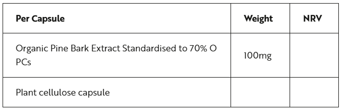 Το βιολογικό εκχύλισμα φλοιού πεύκου συλλέγεται με βιώσιμο τρόπο από σκωτσέζικο πεύκο στη Φινλανδία για να δημιουργήσει ένα καθαρό συμπλήρωμα, πλούσιο σε βιοφλαβονοειδή με υψηλή συγκέντρωση ενεργών OPCs. 100% ενεργά συστατικά που παρασκευάζονται από ειδικούς διατροφολόγους. Προέρχεται από απομακρυσμένα δάση στη βόρεια Φινλανδία, όπου υπάρχει καθαρός αέρας και ελάχιστη ανθρώπινη παρέμβαση. Ο νεαρός φλοιός από τα εσωτερικά και εξωτερικά στρώματα του δέντρου Pinus sylvestris παράγει ένα ισχυρό εκχύλισμα με αναλογία τουλάχιστον 400:1.
